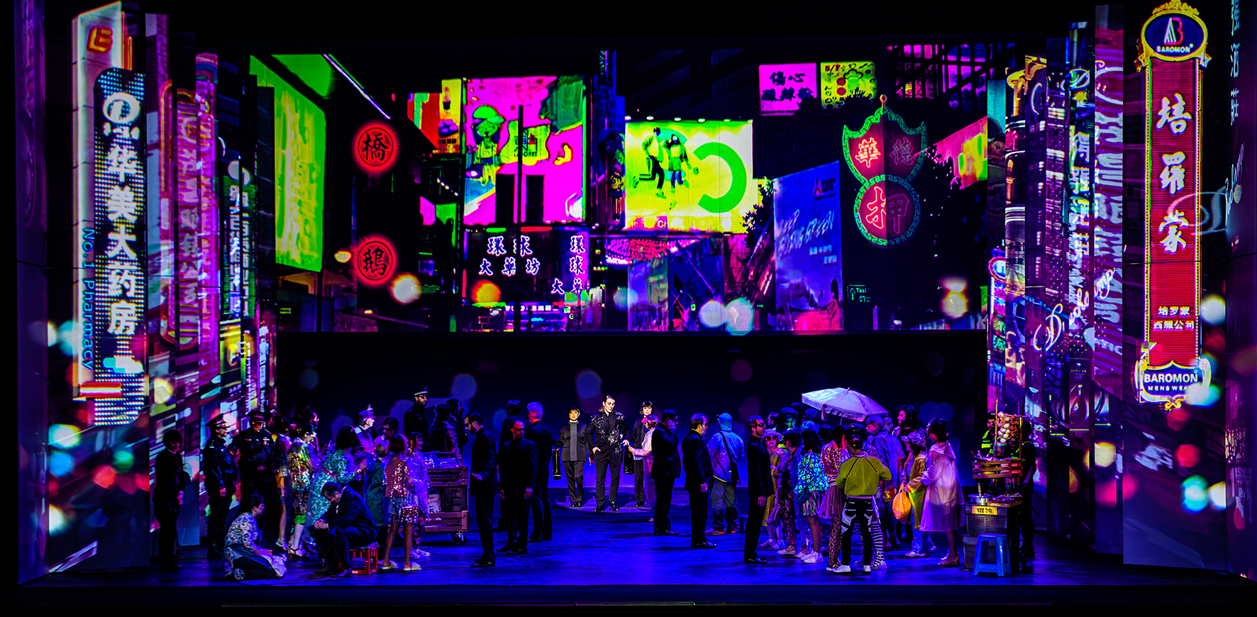Coproducteur du spectacle avec l’Opéra national du Rhin, qui a vu sa création en juin dernier, l’Opéra de Dijon accueille Turandot, dans la mise en scène d’Emmanuelle Bastet. Nous sommes ce soir assez loin de la Chine médiévale imaginaire du livret de Giuseppe Adami et Renato Simoni, tiré de la comédie originale de Carlo Gozzi, avec d’emblée une foule pékinoise qui déambule à côté de multiples enseignes lumineuses colorées, qu’on imagine publicitaires. De rares marchands de rue sont présents, mais aussi de plus nombreux policiers qui surveillent de près tout ce petit monde, sous les caméras à 360° suspendues aux cintres. Les allers et venues de cette modeste multitude perdent toutefois rapidement de leur naturel, dans un espace qui paraît sensiblement étriqué sur le plateau dijonnais.