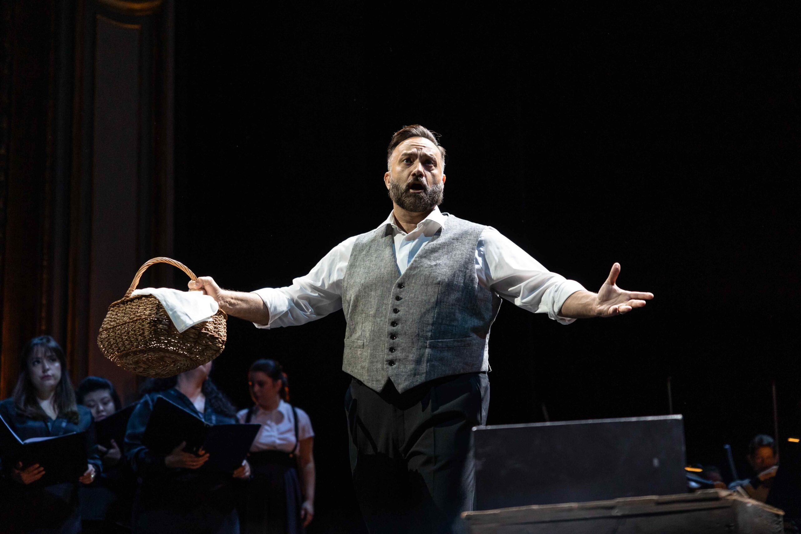 Pour autant la violence et les atrocités sont bien là sur scène. Si l’exécution sommaire du Soldat (hors scène) relève de l’Histoire, le coup de pistolet, la blessure mortelle assénée par le Charpentier relèvent d’une dramaturgie propre aux enjeux non seulement politiques mais aussi familiaux et amoureux qu’on retrouve tout du moins pour les seconds dans Tosca.