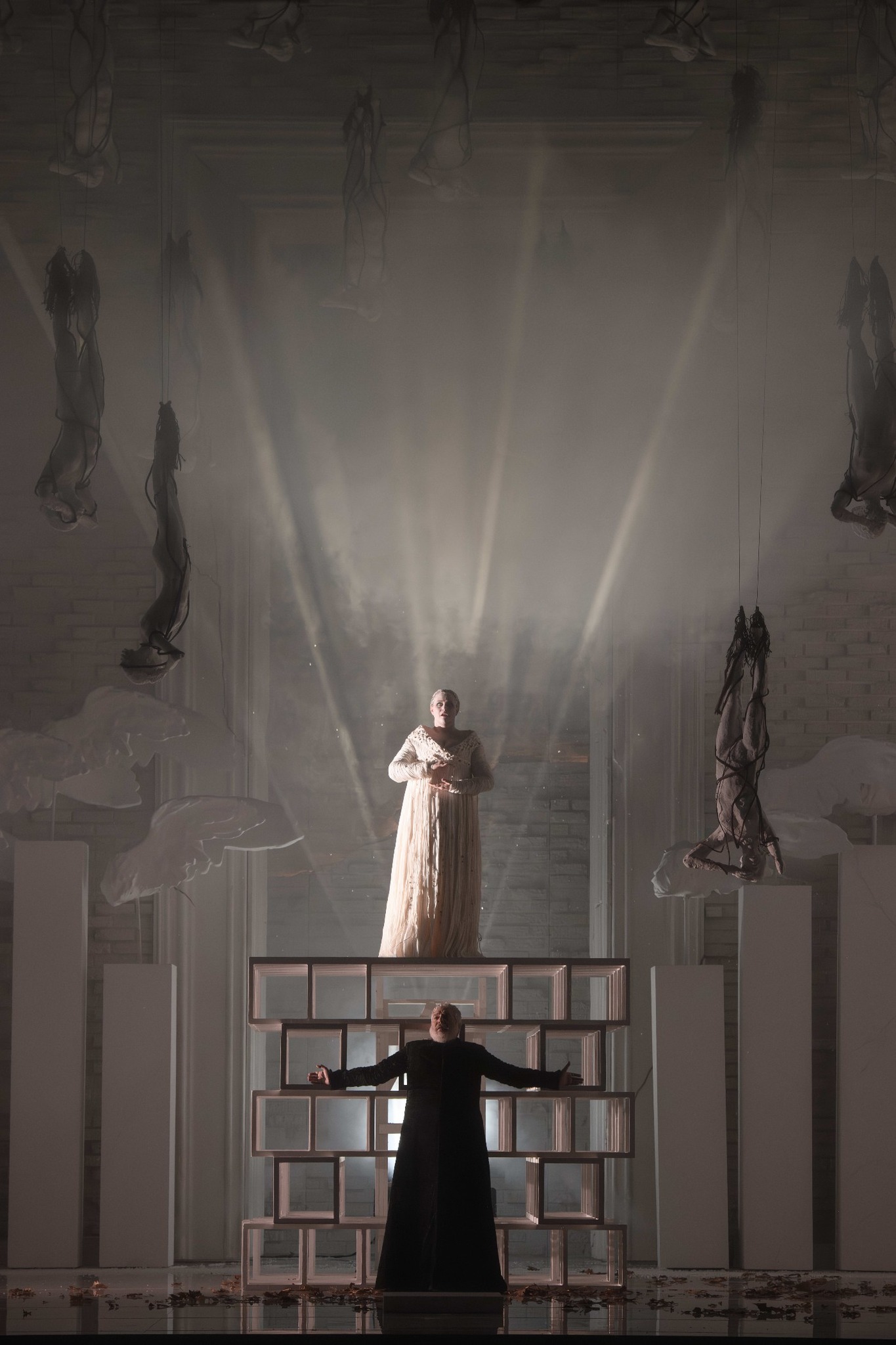 La première transfiguration provient des lumières qui créent la féerie et l’irréalité (les bleus qui ouvrent l’acte II !). La figure du Christ traverse le spectacle en disparaissant lorsque surgissent les flashs érotiques d’Athanaël au premier acte ; après plusieurs occurrences, il émanera dans le finale de l’opéra de la cellule modulaire de Thaïs. L’ouvrage fondé sur la pénitence verra ceux qui souffrent et expient drapés de noir ; noir aussi pour les invités masqués lors de la fête de Nicias ; les bannières agitées renvoient aux stupres d’Alexandrie. La mort à soi-même présente dans la mystique chrétienne fera émerger toutes sortes de processions mortuaires. On n’aura jamais montré Massenet comme allant aussi loin scéniquement dans sa peinture de la femme pécheresse (mais « sauvée » !) à laquelle on rattache souvent son œuvre.