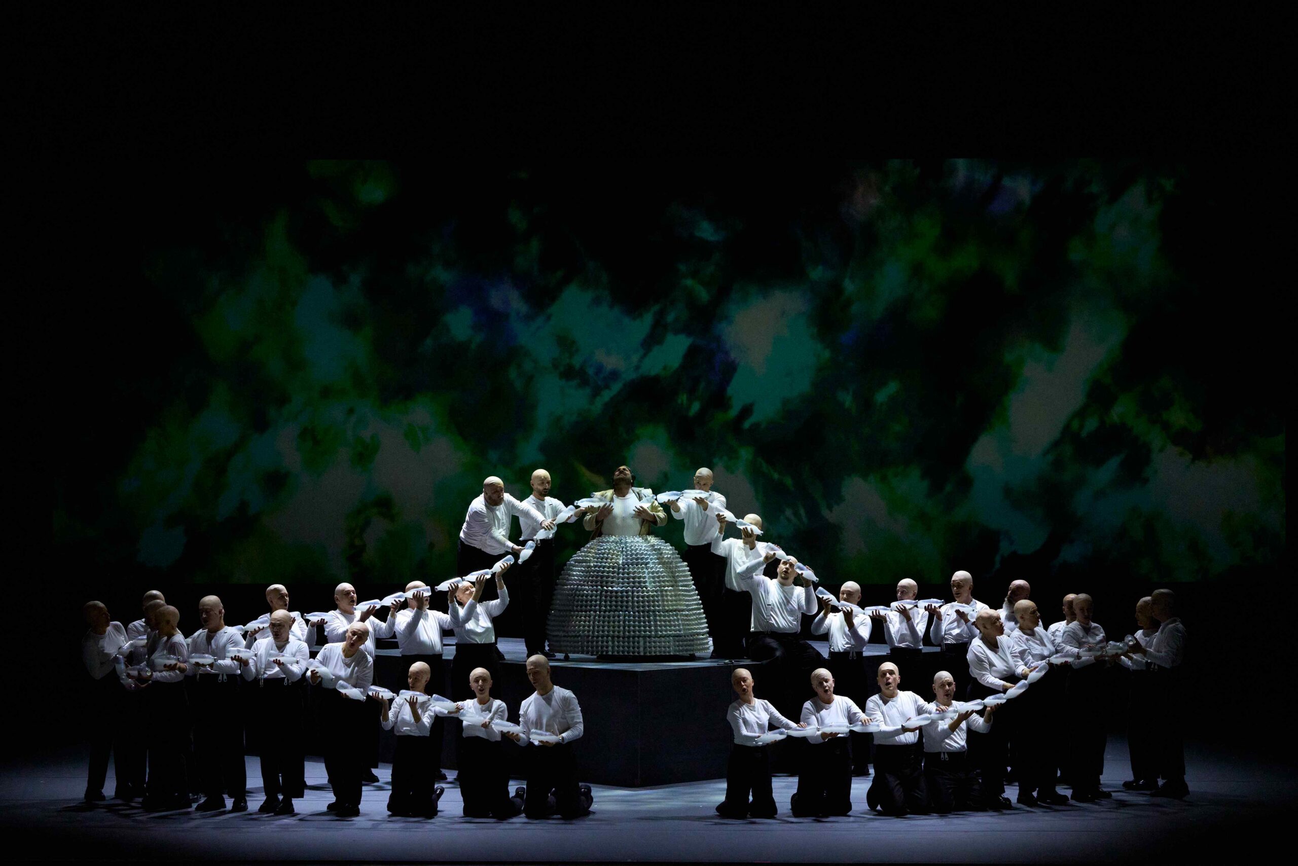 Déjà présents au Grand Théâtre de Genève ces dernières années pour Les Indes galantes (2019) puis Atys (2022), Leonardo García Alarcón et son orchestre de la Cappella Mediterranea confirment une fois de plus leur position parmi les toute meilleures formations baroques du moment. Dès l’Ouverture, l’animation musicale est dynamique et vivante, avec des cordes virtuoses, des cuivres qui jouent avec assurance et franchise, puis plus tard un continuo toujours délicat et équilibré. Les tempi sont précis et bien suivis, avec quelques silences subits qui portent l’action théâtrale. Les choristes du Grand Théâtre de Genève font aussi preuve d’une cohésion sans failles, femmes et hommes au crâne chauve qui donnent souvent l’impression d’une longue cérémonie, funèbre suivant les moments.