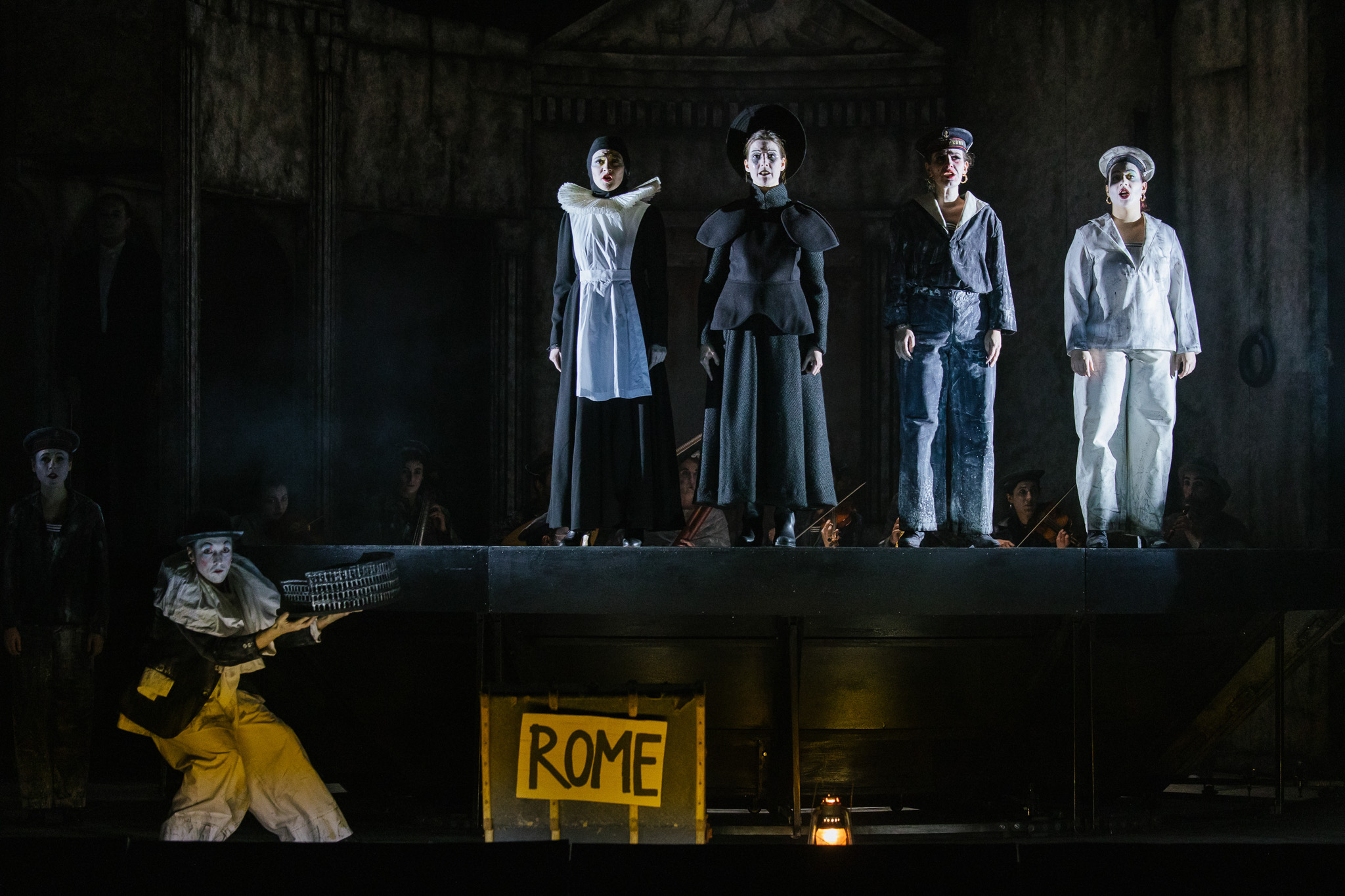 Le dispositif scénique pivotant en forme d’arène à demi ruinée dans laquelle est greffé un phare antique n’a aucun mal à prendre des allures de vaisseau de pierre puis de vaisseau tout court mais il peut aussi se faire port d’attache, ou amphithéâtre pour l’agonie finale. Son arrière, quand il se révèle, a la noirceur des jeux maléfiques qui se jouent en coulisses. Le portique dont il est couronné s’ouvre et se ferme sur des ailleurs qui peuvent prendre la forme de mer déchaînée, de nature foisonnante à la douanier Rousseau, de Troie en flamme, se faire porte d’un enfer de théâtre ou simplement porter le souffle de la brise par son effet sur les tulles qu’elle agite. La vastité des mers est suggérée par trois grandes voiles qui masquent le fond de scène et laissent libre court à l’imagination de l’espace. L’ensemble est plastiquement très beau et n’est pas sans rappeler le graphisme de Bernard Buffet. L’avantage de ce dispositif, outre une constante mobilité qui ne laisse jamais le statique s’installer, est de rendre comme évidente la présence et le poids d’un équipage. L’existence de marins, à peine amorcée et suggérée par le livret de Tate, est ici largement exposée et ajoute une autre dimension qui est celle du tiraillement entre l’appel de la mer et celui des délices de l’escale. Elle rend palpable la pression exercée sur le capitaine par un équipage fatigué d’être ballotté au gré des caprices des eaux. C’est dans cet esprit qu’interviennent les ajouts chantés.