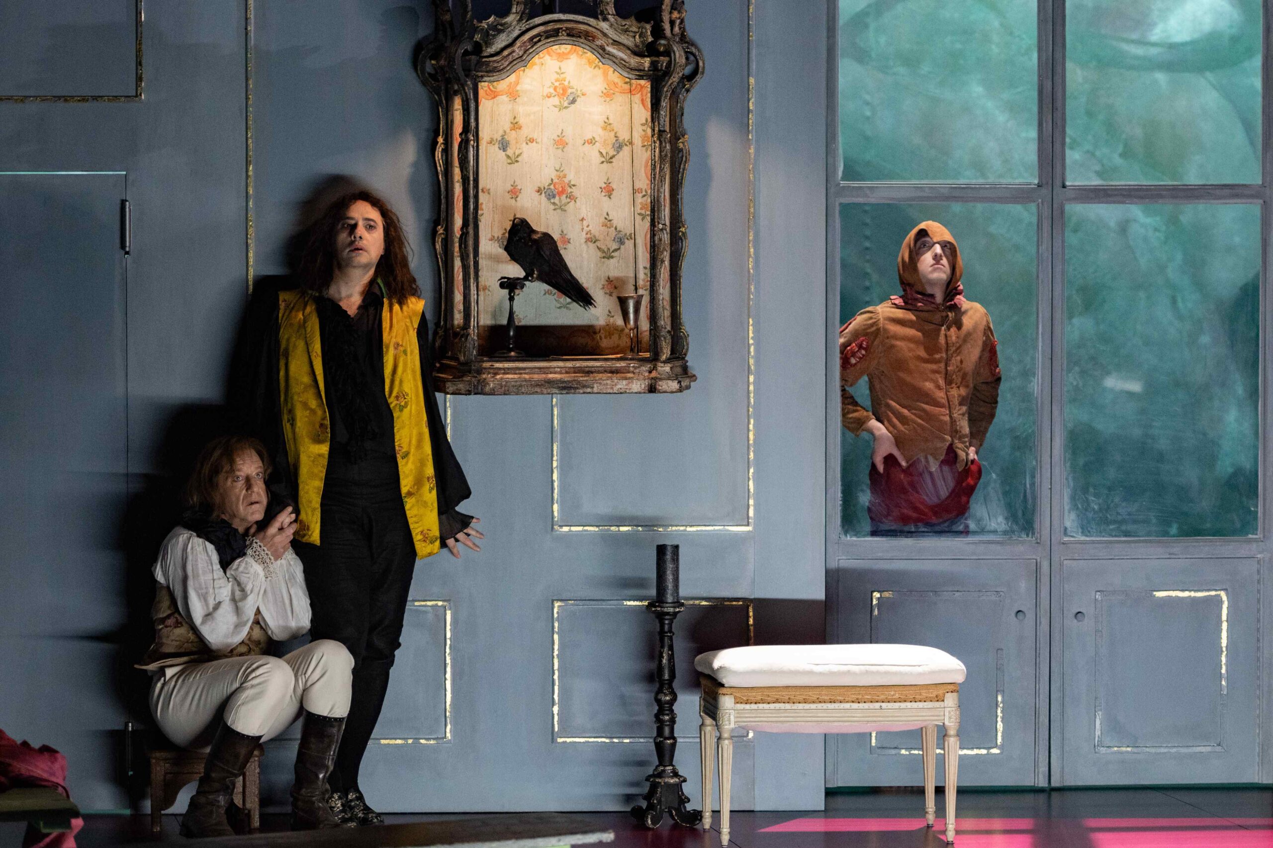 Ici, le renard de la célèbre fable de Jean de la Fontaine revêt l’apparence de sa proie : le corbeau. Tout de noir vêtu, Dom Juan, admirablement interprété par Xavier Gallais, se vêt du ramage et du plumage charismatique de l’oiseau nécrophage, empaillé et exposé au beau milieu de la scène. De son corps voilé de noir, il déambule dans l’espace avec virtuosité.