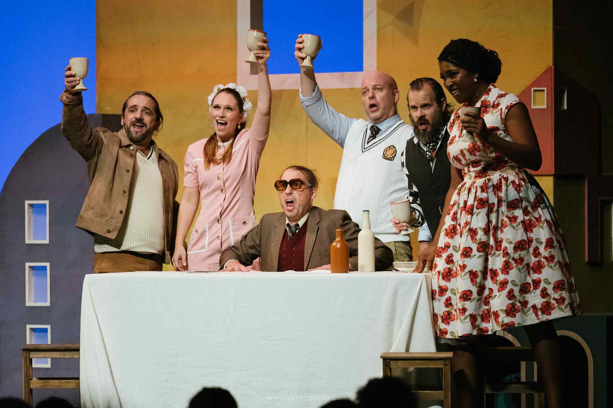 La dramaturgie adoptée est celle d’une transposition sans fracas. On est dans du contemporain très large. Don Procopio (Guillaume Paire) pourrait parfaitement être un de ces vieux garçons pathétiques désocialisés qu’on croise parfois aujourd’hui. Don Andronico (Ronan Debois) oscille entre le style manouche et un troisième rôle chez Sergio Leone. Jazmin Black-Grollemund (Eufemia) rehaussée sur talons pour mieux accentuer sa domination sur lui est très Vacances Romaines, tandis qu’Alexandra Hewson (Bettina) passe de la gentille jeune première de romance au chic façon parisienne années 70. On frise l’italianade juste ce qu’il faut.