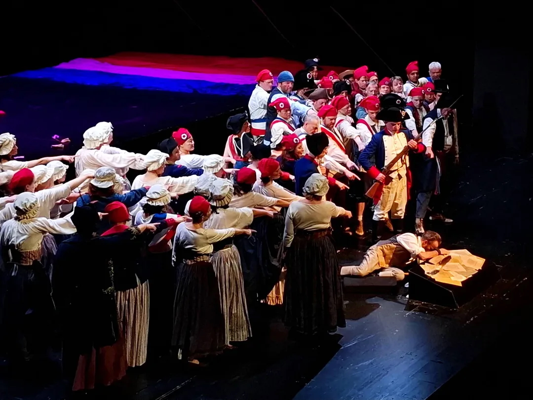 Pour sa cinquantième représentation in loco, la production signée John Dew présentée à la Deutsche Oper en cette période de Noël nous a ravis : beauté simple des décors, des costumes – jusqu’aux tenues extravagantes des nobles au premier acte ! – ingéniosité signifiante du dispositif scénique, avec ce sol qui bascule au moment même où la Révolution renverse (au sens strict !) l’ordre établi. Si l’on ajoute tous ces détails bien en situation (comme ces plumes qui voltigent aux mains des révolutionnaires alors que la harpe virevolte au III), nous tenons là une production efficace, percutante, à laquelle manque peut-être une direction d’acteurs prenant en compte la diversité des personnalités présentes sur le plateau – une gageure quand il s’agit d’une énième reprise, mais qu’il faudrait pourtant mener à bien dans l’absolu.