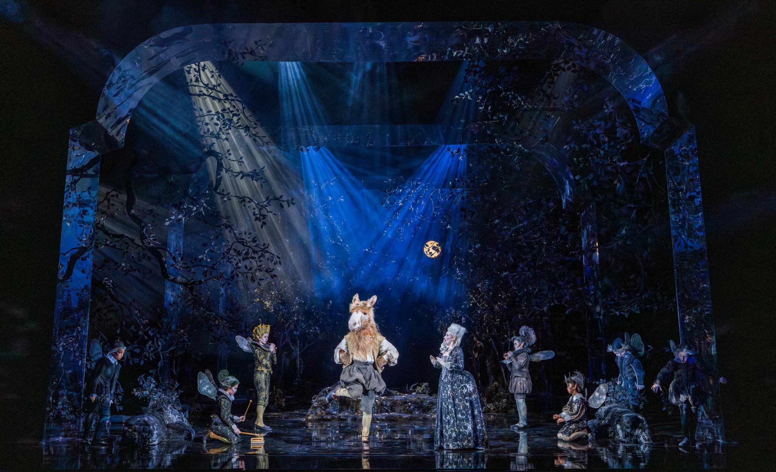 En ce soir de 100e – annoncée par Stephen Langridge himself devant le rideau, au plus grand ravissement du public – tout nous a semblé atteindre ce degré de perfection digne, par exemple, de l’évidence française d’une Cantatrice chauve à la Huchette. Le chef-d’œuvre de Britten, aussi composite, hétéroclite et protéiforme que la merveille shakespearienne, avec ses inspirations multiples, ses inventions rythmiques et harmoniques incessantes, un sens irrésistible de l’emprunt parodique ainsi que ce mélange de rire et d’émotion pure, trouve ici un accomplissement visuel et théâtral juste idéal. Lynne Hockney a eu la charge de faire revivre cette ancienne production… qui semble pourtant avoir été créée au début du cru 2025 ! Si poussière il y a, c’est de la poussière d’étoiles ! Les lumières (Paul Pyant) magnifient le décor (John Bury). Les costumes nous font retomber en enfance – avec ce léger recul et cette touche d’ironie indispensables. Il faut dire aussi que tout ici transpire l’ADN anglais, jusqu’au Trinity Boys Choir d’une luminescence sonore et d’une justesse sidérantes.