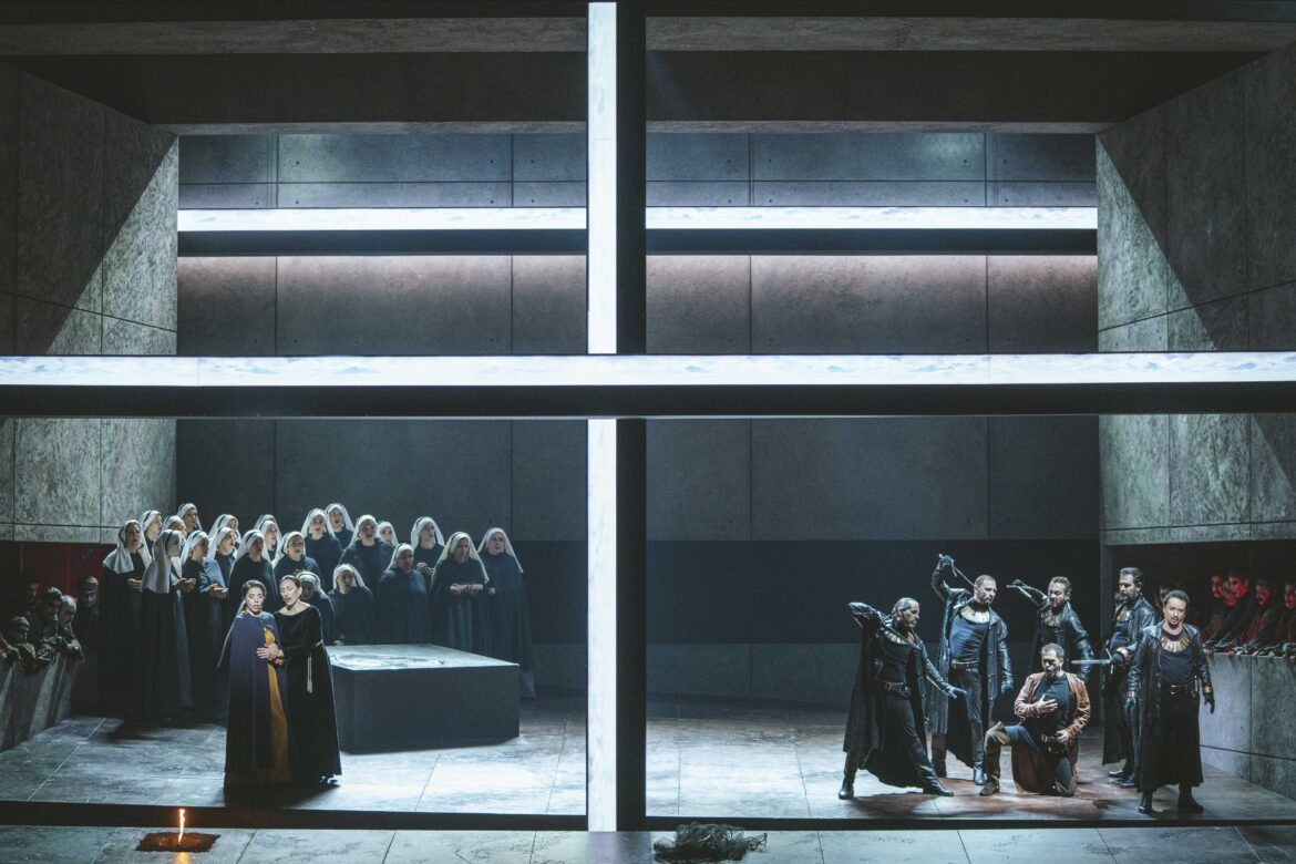 Il Trovatore opéra incandescent de passion, de fureur et de sang est aussi une « tragédie nocturne », ce qu’a parfaitement compris le metteur en scène Francisco Negrin dans un travail en parfaite osmose avec Bruno Poet, concepteur des lumières. Tout se passe en un lieu unique dans un décor particulièrement dépouillé, aux lignes géométriques, signé Louis Désiré (à qui l’on doit, en outre, des costumes intemporels mais pour autant suggestifs). Peu de choses sur le plateau, à l’exception, à cour et jardin, de deux murs entrecoupés d’ouvertures carrées, d’un bloc taillé dans la pierre – indifféremment table, autel ou brasier – et, en fond de scène, une plateforme qui monte et descend au fil des circonstances : évocation d’un au-delà où l’ombre de la mère d’Azucena veille sur les événements – ou tente de les modifier – alternant avec l’omniprésence du fantôme de l’enfant portant la faux de la mort, symbole mystérieux et obsessionnel qui plane le long de l’ouvrage. Par ailleurs, les chœurs ne sont pas associés en permanence à l’action : ils en sont plutôt les spectateurs pareils à des spectres tout droit sortis de leurs sépulcres pour hanter les lieux. Le feu est omniprésent pour rappeler notamment que la mère d’Azucena, accusée de sorcellerie, brûla jadis sur le bûcher. Un drame de la mémoire, presque un cauchemar éveillé ,un univers mental hanté par le souvenir et la fatalité plutôt qu’un cadre historique défini.