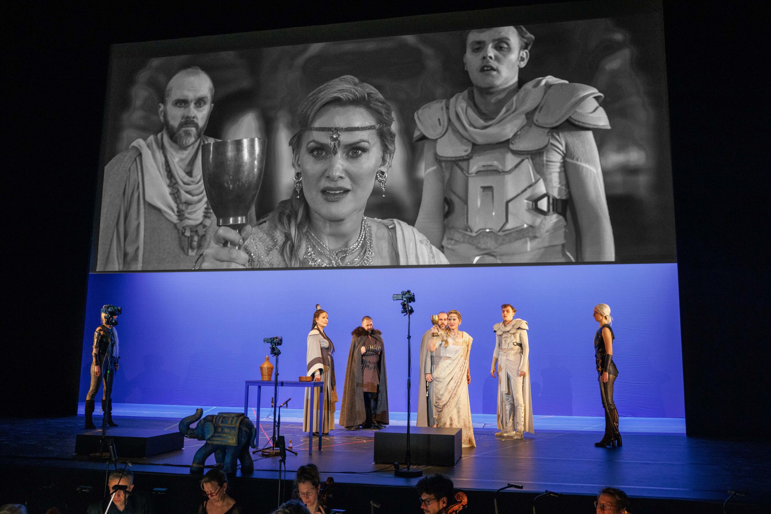 La nouvelle production du Händel Festspiele de Karlsruhe est à la charge de Kobie van Rensburg, qui signe la mise en scène, les décors et costumes, ainsi que la vidéo. Cette dernière composante revêt une importance toute particulière dans la conception, il s’agit plus précisément de l’élément essentiel de cette réalisation visuelle. Trois caméras sur trépieds filment en effet les protagonistes, sur fond bleu, pour incruster en direct les images dans des décors vidéo de synthèse, l’ensemble projeté sur un grand écran en hauteur. Le procédé n’est pas nouveau (merci au bulletin météo qui passe depuis de nombreuses années à la télévision !), mais le résultat, en noir et blanc, est très réussi et souvent teinté d’un humour bienvenu. On voit par exemple Irene, puis plus tard Andronico, faire un petit voyage en tapis volant, Tamerlano et Andronico se faire cuire des brochettes autour d’un vrai-faux feu, ou encore Tamerlano et Irene saluer la foule à dos d’éléphant. Des femmes, habillées en combinaison bleue intégrale afin de rester invisibles à l’écran, viennent changer les accessoires de temps à autre.