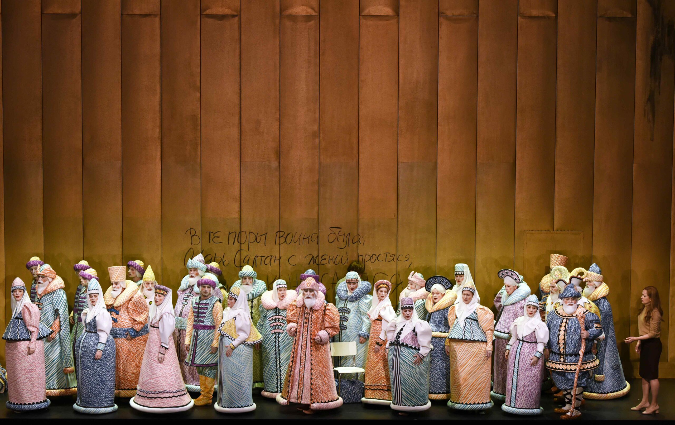 Les autres rôles sont moins développés, à commencer par le titre distribué à Ante Jerkunica, basse imposante et au grave profond qui interprète un autoritaire Tsar Saltane, même si le registre aigu se révèle plus fragile. Les interventions successives de la soprano Olga Kulchynska en Princesse Cygne enchantent nos oreilles, timbre séduisant et musicalité sans faille, très agile et souple dans l’aigu. Son duo d’amour avec Gvidon en fin de troisième acte est un très beau passage lyrique, Militrissa restant toutefois sur le qui-vive en cas de problème. Parmi les trois femmes cruelles, c’est la voix sombre du personnage de la vieille mère Babarikha, sans doute caricaturale, qui impressionne le plus, tenu par Carole Wilson. Les deux affreuses sœurs, qui trouveraient aisément leur place chez la Cendrillon de Charles Perrault, sont également bien en place vocalement : Stine Marie Fischer (Tkatchikha) et Bernarda Bobro (Povarikha). Les autres rôles masculins complètent idéalement : Alexander Vassiliev qui a fort à faire en Bouffon Skomorokh (il faut chanter, danser et jouer en même temps du tambourin), Nicky Spence en Messager, ainsi que l’autre ténor en Vieil Homme, le vétéran Alexander Kravets.