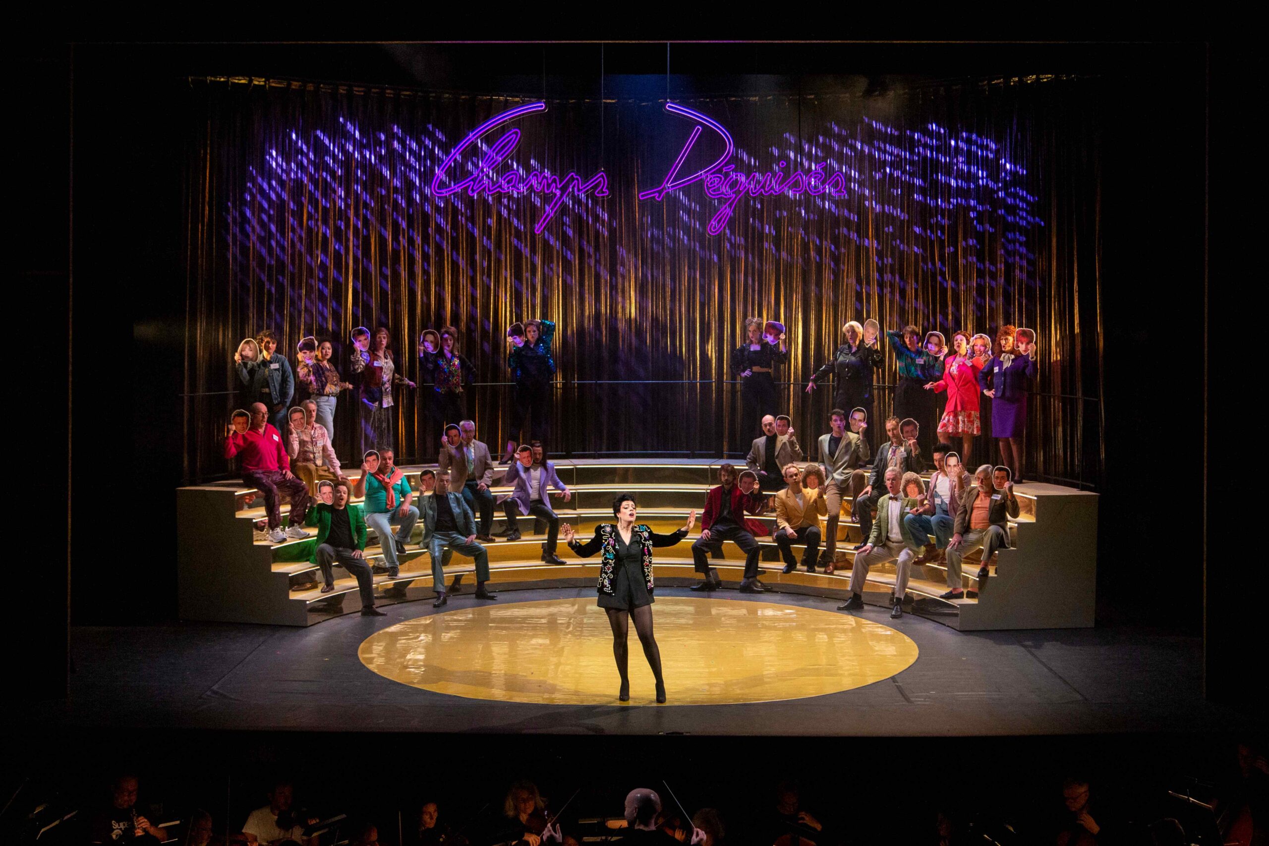 Très paradoxalement le spectacle onirique n’en met pas moins en évidence la partition du compositeur donnée dans son intégralité. Plusieurs des airs sont « entourés » par des ballets, les chorégraphies, signées Aurélie Mouihade et Karine Girard, mettent en abyme le festif du Second Empire tout en déclinant les danses des années 80. Les textes lus sur fiche gagnent de leur artificialité, l’échange lu Faust / Marguerite faisant perdre quelques repères au spectateur devenu joueur. Les personnages du drame conviés à l’émission (Siébel, Brander, Wagner, Altmayer…) se déplacent avec fluidité et naturel ; les costumes de Sabine Schlemmer, issus du vestiaire de tous les jours, mais étudié, finissent par les rapprocher de nous.