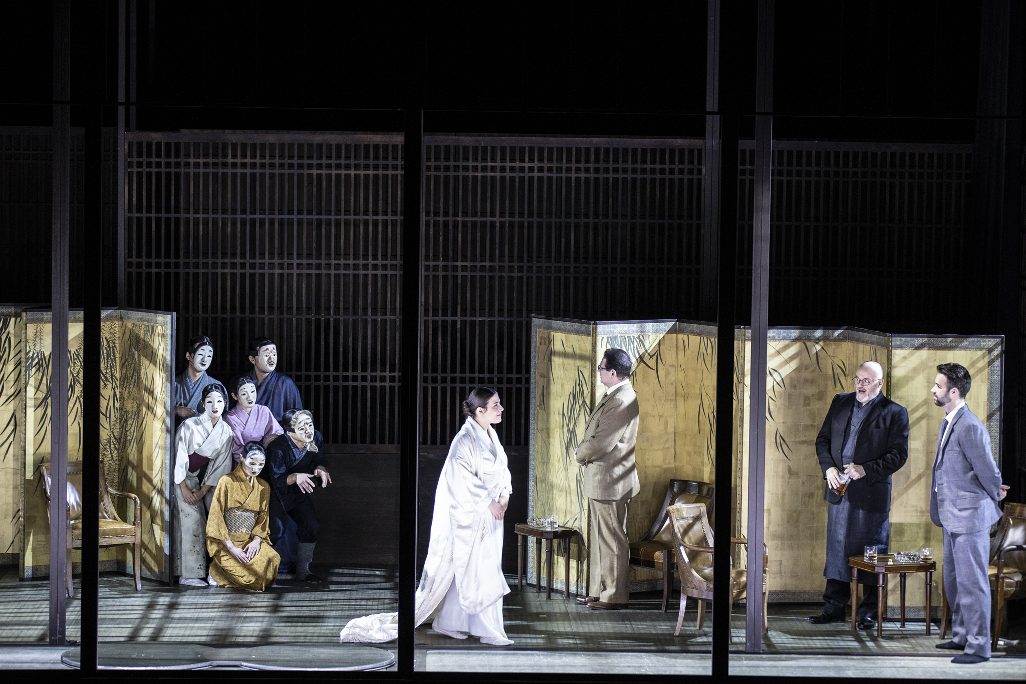Si les masques et pantomimes s’avèrent plutôt opportuns (encore que ces dernières – surtout l’évocation des cigognes, avec les symboles qu’elles véhiculent – suscitent les plus poétiques images), certains éléments n’apportent rien. Ainsi le tapis roulant sur lequel défile tel ou tel personnage ou la relégation des chœurs en coulisses, qui a des conséquences dommageables sur le rendu acoustique. Un autre point interroge davantage : alors que la direction d’acteurs se révèle satisfaisante, pourquoi renforcer le statisme d’une action déjà foncièrement figée ? Ainsi, la scène princeps, avec la visite des lieux par Pinkerton sous la conduite du marieur Goro, se fait personnages assis, en contradiction du texte. À ce sujet, une énigme subsiste : qui est donc cet individu muet en complet brun qui ne reparaîtra plus ensuite ? Puccini ? Par ailleurs, l’éradication du jardin (alors que les fleurs évoquées sont une substance capitale dans la culture nippone) constitue une erreur. Quant à l’affirmation : « Il n’y aura pas pour autant de décor unique », ce que l’on voit la réfute, puisque seuls des objets mobiliers (élégants paravents d’un jaune doré atteint par les outrages du temps, candélabres…etc.) viennent varier la configuration qui demeure toujours la même. Et à juste titre ! Puisque, dans le livret écrit par Giacosa et Illica, tout se déroule autour d’une maison typiquement japonaise des hauteurs de Nagasaki symbolisant l’enfermement d’une héroïne coupée du monde autant que des siens. Quoi qu’il en soit, le résultat d’ensemble n’appelle aucun reproche majeur, tant l’action reste constamment lisible, les rapports entre les personnages cohérents, la plastique sagace.