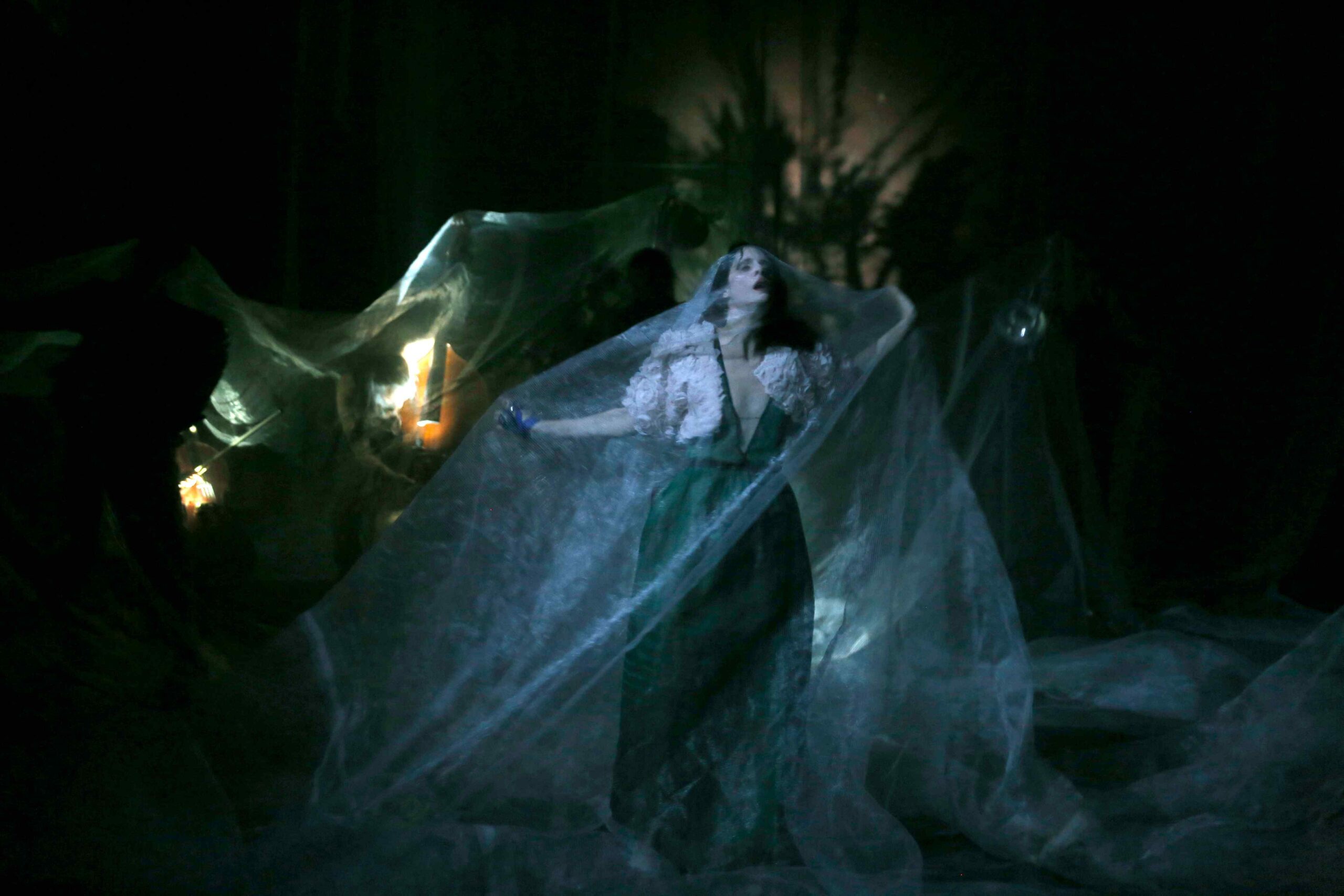 Tout commence dans l’obscurité complète avant qu’une timide lueur ne laisse surgir un vaste voile, similaire à du tulle, sous lequel s’égayent les participants à une soirée plutôt libérée d’esprit. Or, les premières minutes semblent bien longues, voire lassantes. Mais l’on réalise, ensuite, que cette sensation d’étouffement délibérée traduit la convention même d’un enivrement factice par lequel l’héroïne centrale se perd dans « les tourbillons de volupté ».