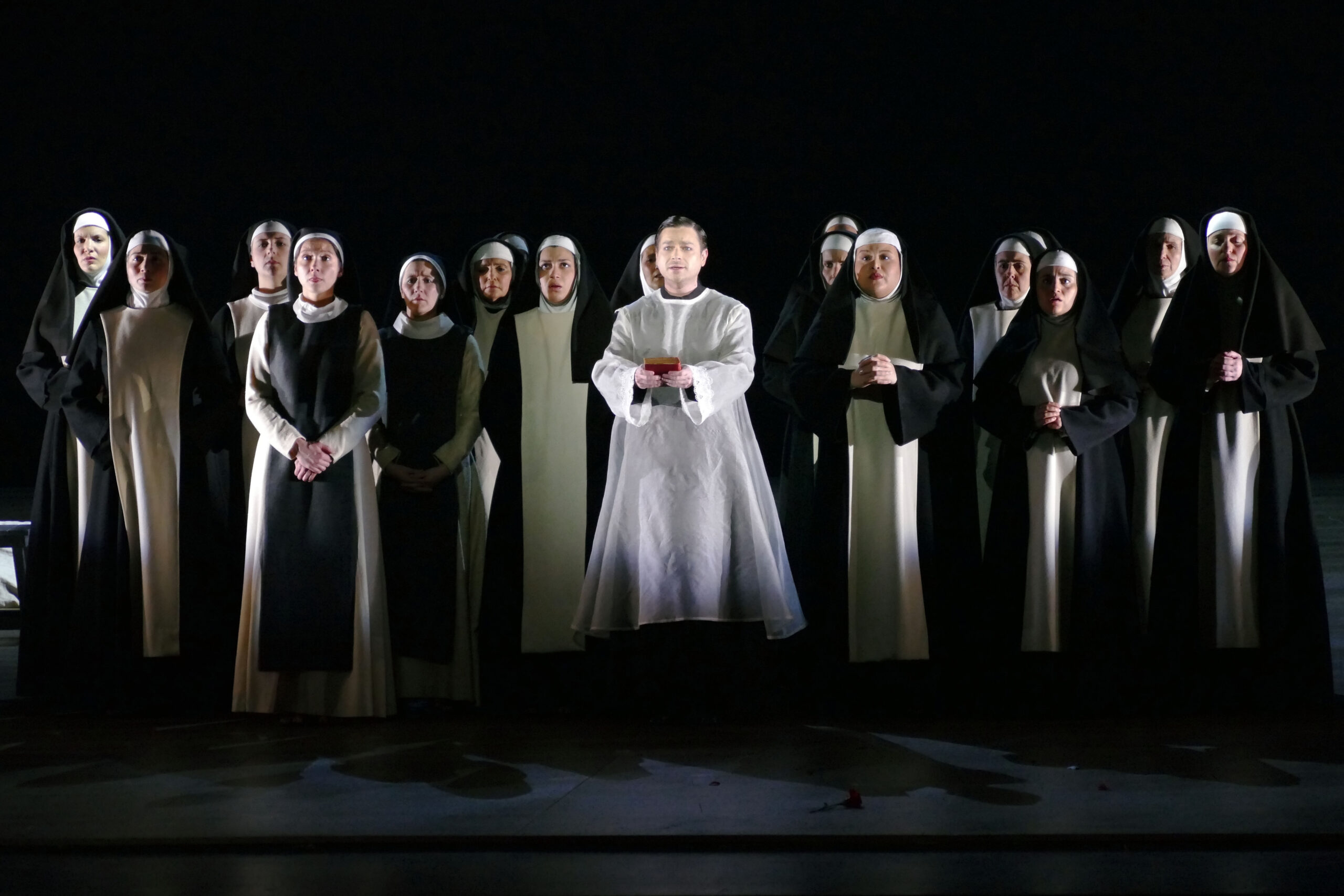 Commençons par dire que l’on n’a pas souvenir d’avoir assisté à une représentation des Dialogues qui nous ait déçu ni qui ne nous ait bouleversé par l’impact que trouve ici, plus que dans tout autre ouvrage lyrique, la notion de travail collectif. Dans cet opéra, en effet, chacun(e) croit fermement à ce qu’il est en train d’accomplir sur scène et, disons le d’emblée, la mise en scène de Louis Désiré et de ses collaborateurs habituels Diégo Méndez-Casariego, pour les décors et les costumes, et Patrick Mééüs, pour la conception des lumières, est un exemple de mise en valeur de tous les personnages, la communauté des carmélites en premier lieu.