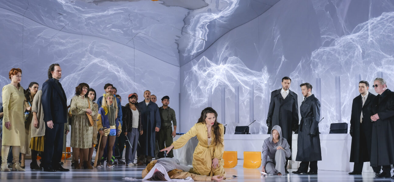 Le plafond est composé de miroirs qui projettent d’irréels reflets. Cet ensemble scénographe du plus bel effet permet de représenter, la geôle où est emprisonné l’Etranger, le tribunal où est jugée Héliane puis la place publique, lieu du jugement. Une mention particulière pour les décors et lumières de Guido Peztzold. Tanja Liebermann a dessiné les costumes, contemporains et classiques, mais elle aurait dû éviter la surcharge inesthétique des vêtements des choristes, surtout au second acte, avec la présence d’une poubelle au dernier acte ???