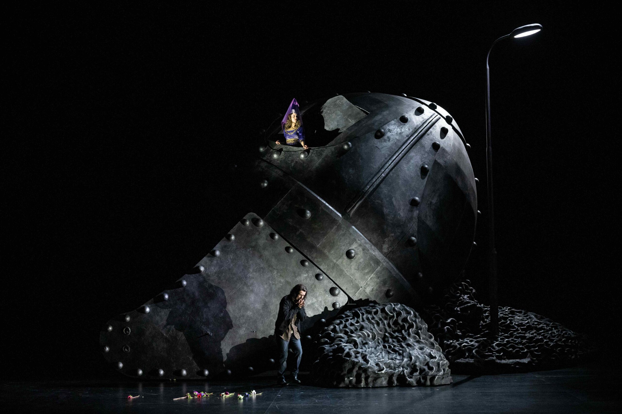 Lorsque le rideau se lève sur la mise en scène de Mariame Clément, on découvre un heaume géant posé à terre, superbement éclairé par les lumières en clair-obscur de Valerio Tiberi. Quelques vidéos discrètes en noir et blanc sont aussi utilisées, par exemple le visage d’Orlando qui apparaît sur le casque, comme son reflet, avec le personnage qui fait face à la paroi. Une ouverture en partie supérieure du casque laisse apparaître de temps à autre certains protagonistes, qui s’y tiennent comme sur un balcon, d’abord Zoroastro puis Angelica en habits de princesse. Orlando a un double, qui fort heureusement n’est pas omniprésent.