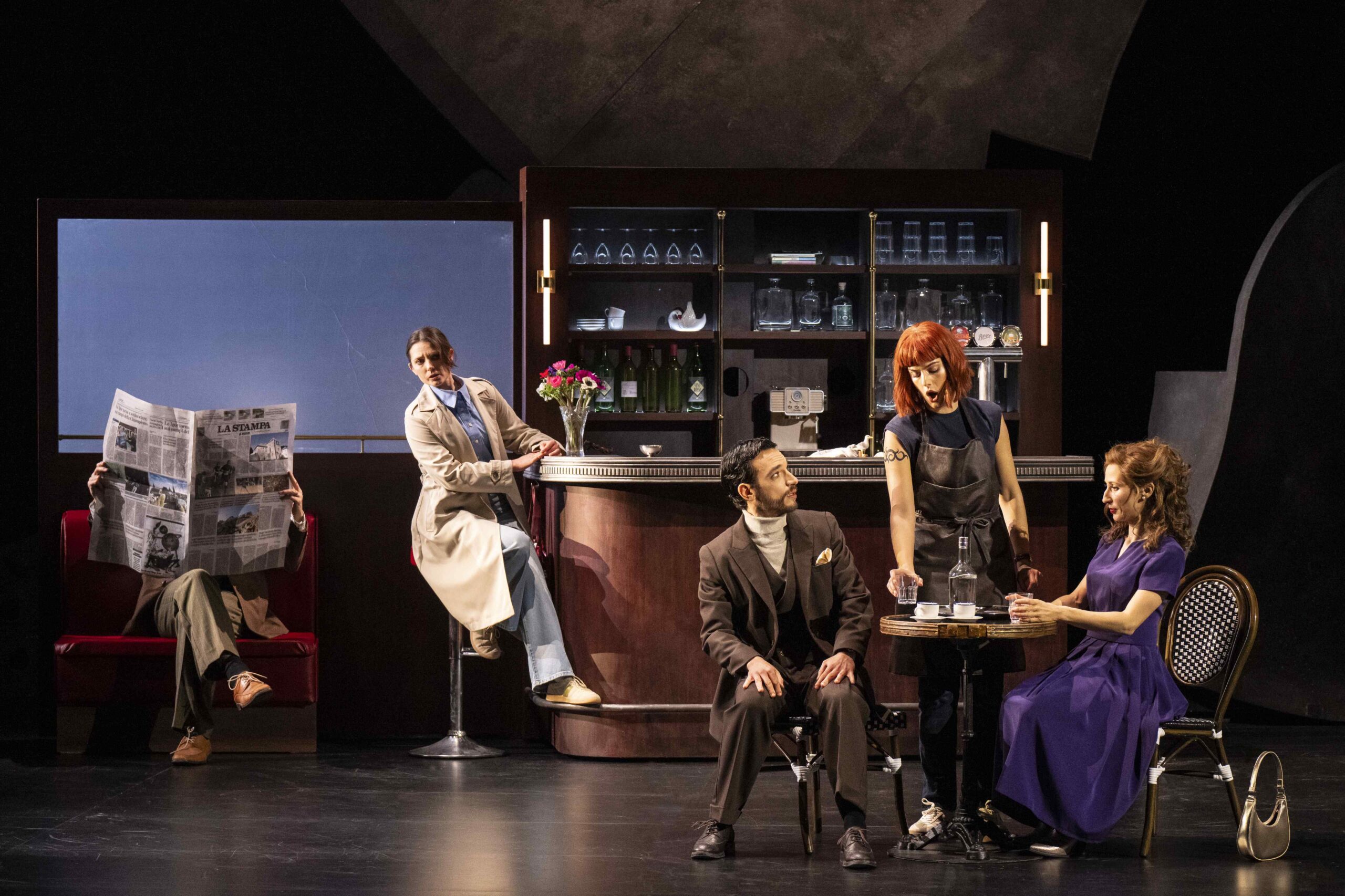 Quand le casque géant s’ouvre en pivotant sur le plateau, on découvre la seconde configuration de la scénographie de Kaspar Glarner, soit un petit café élégant à l’italienne (on y lit « La Stampa »), avec son comptoir, une table et deux chaises. Les scènes de jalousie deviennent parfois discussions de la vie courante, et même par instants en limite de théâtre de boulevard ou marivaudage, quand Zoroastre, puis Medoro avec lui, se cachent derrière le journal tout en marchant, afin de voir sans être vus. On s’éloigne certes significativement de l’ambiance bucolique de l’opéra lorsque la supposée bergère Dorinda chante son air au rossignol « Quando spieghi i tuoi tormenti amoroso rosignolo », ici la nuit, à côté d’un lampadaire et cigarette au bec. Un peu plus tard, c’est devant un comptoir d’enregistrement d’aéroport que Medoro et Angelica tentent de fuir la colère d’Orlando, Zoroastre se tient en habits de commandant de bord et les vols de la compagnie « Ariost Airlines » sont affichés à l’écran.
