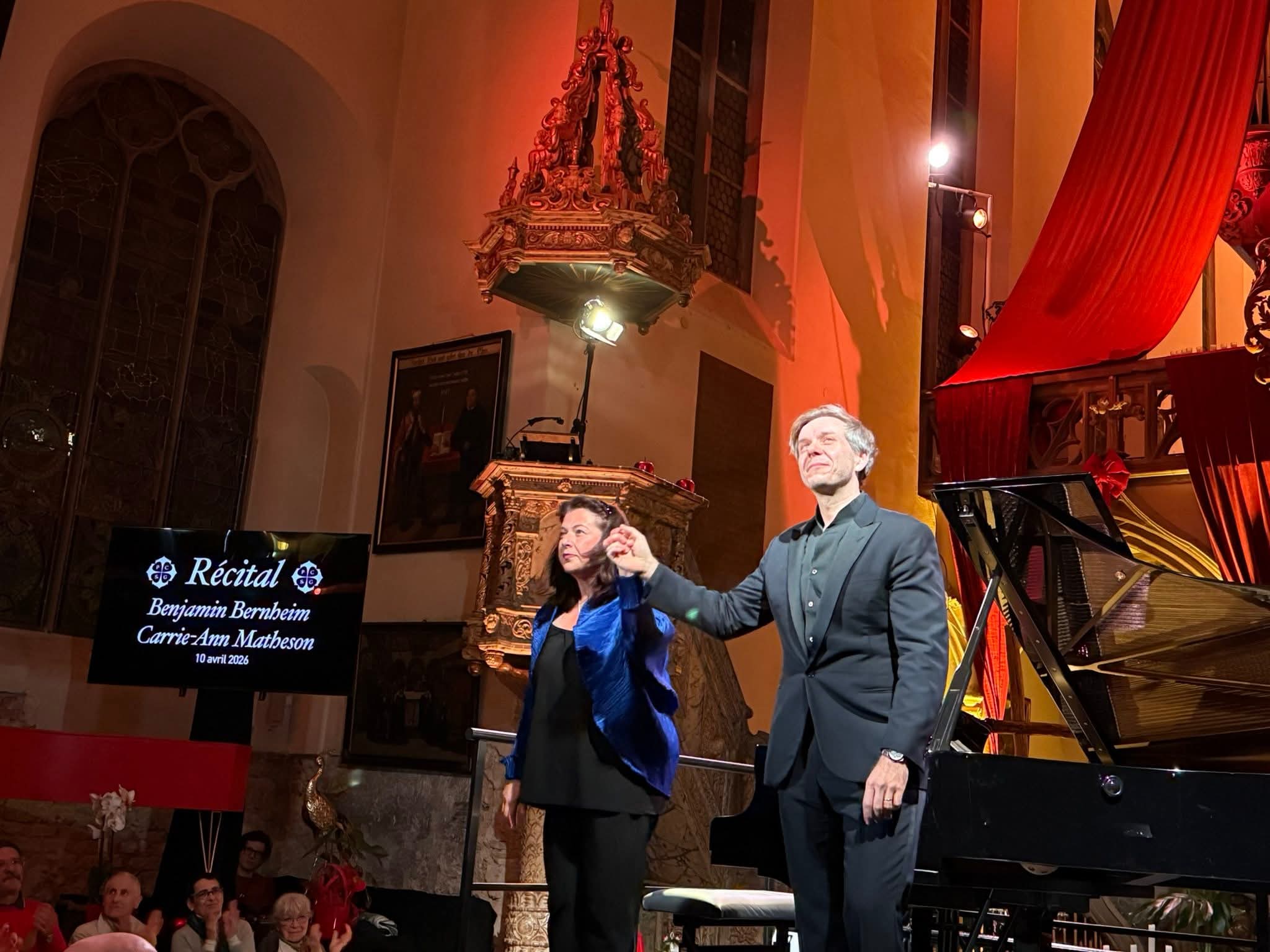 Une chaleureuse ovation accueille Benjamin Bernheim, qui entre, souriant, accompagné de sa pianiste Carrie-Ann Matheson toute aussi réjouie, dans la nef comble et superbement éclairée de l’Église Saint-Guillaume.