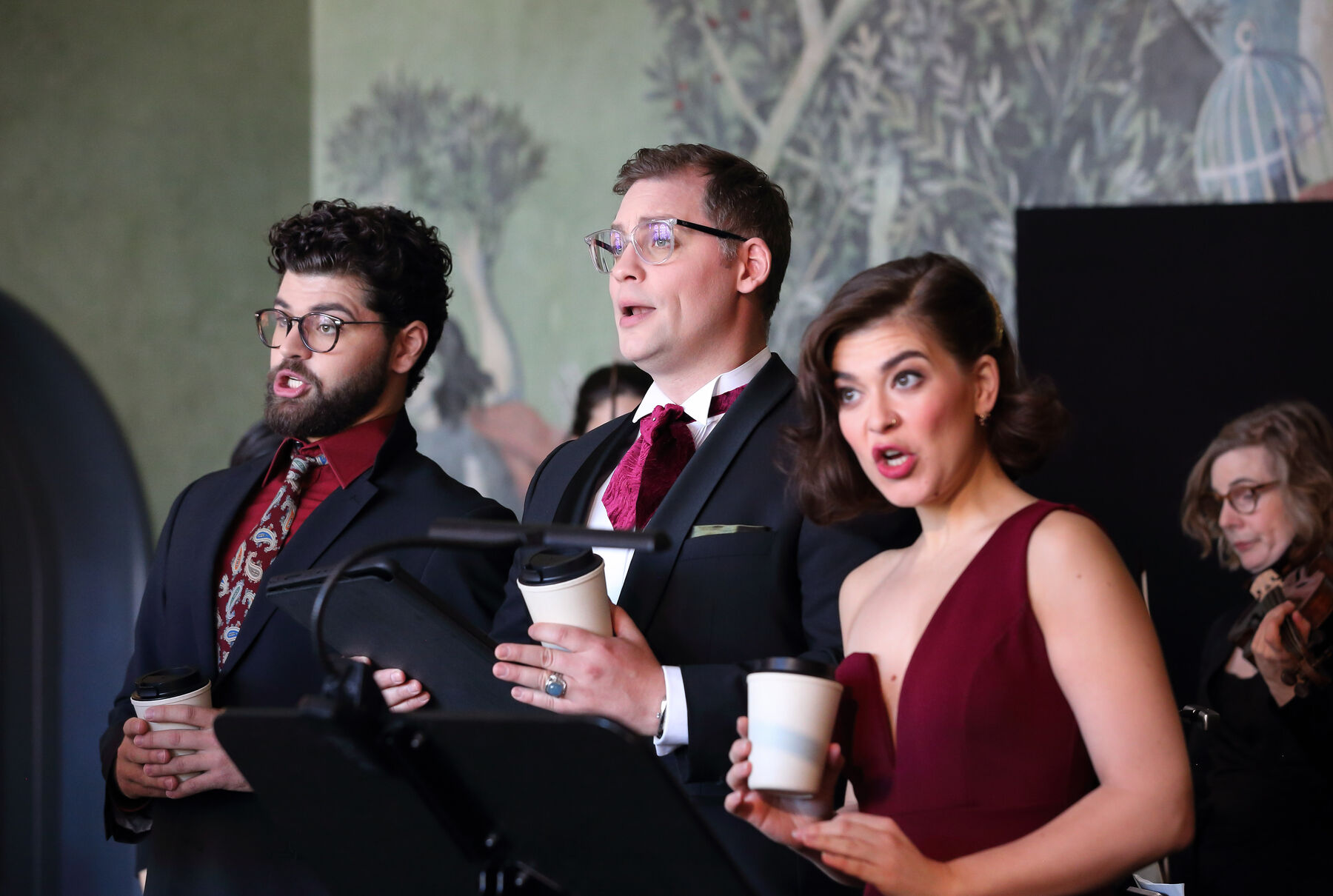 Les chanteurs, tous trois exceptionnels, jouent le jeu aussi bien qu’ils le chantent. Ils rendent honneur à l’ingéniosité et à la richesse d’inspiration délicieuses de la partition. Le narrateur et bientôt fiancé est interprété par le ténor hongrois Guyla Rab qui chante sa partie de sa voix puissante et chaleureuse avec une diction et une projection parfaites. La soprano autrichienne Sophia Keiler, fraîche recrue de la troupe du théâtre qu’elle a rejoint la saison dernière, donne une jeune Liesgen ravissante, aussi passionnée qu’enjôleuse et astucieuse, à laquelle elle apporte sa voix lumineuse, crémeuse et légère comme la mousse dorée que l’on retrouve sur les meilleurs capuccinos. La basse bavaroise Lukas Enoch Lemcke endosse avec bonhomie le rôle du père débonnaire qui, malgré les profondeurs et les graves somptueux de sa voix chaleureuse et le parfait équilibre entre le souffle et la résonance, peine à résister à la détermination entêtée de sa fille et finit par se convertir à la chapelle du revigorant breuvage. Après les tasses, le trio cédera à la modernité des gobelets en carton recyclable, un dernier clin d’œil amusé de la mise en scène. L’humour provient du texte plutôt que de la musique qui, d’une beauté toute séraphique, est comme en tension avec la trivialité de la dispute familière.