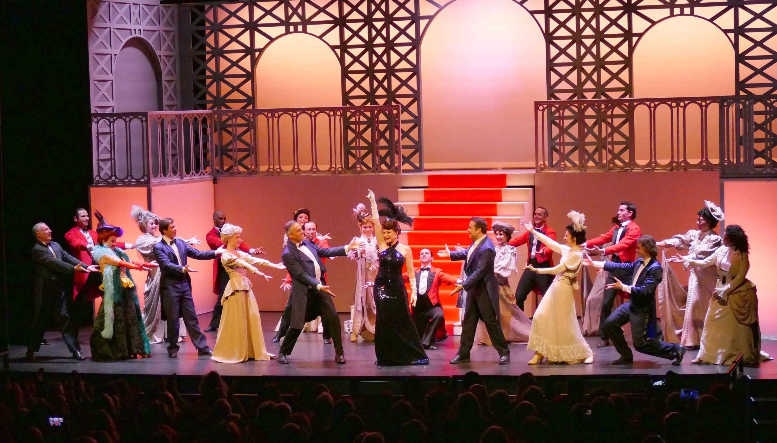 La scénographie adopte également une solution intelligente de simplification dramaturgique. Plutôt que de multiplier les changements de décor, la production repose sur un dispositif scénique unique à deux niveaux, pouvant évoquer aussi bien une rue, une boutique ou un cabaret . Quelques éléments mobiles, tel un escalier de revue, suffisent à transformer l’espace et à faire évoluer l’action.